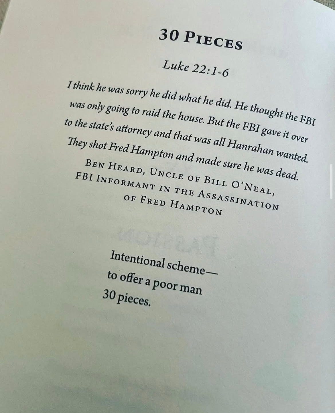 If there’s anything the governing authorities don’t want, it’s for those whom they’ve marginalized to be in solidarity with one another, and begin to push back against their unjust power. Hampton was assassinated by the FBI at just 21 years old in 1969. To only talk about Judas is like only paying attention to Bill O’Neil, who was a poor man who the FBI paid for intel on Hampton, while neglecting to hold the FBI accountable. It was an intentional scheme to offer a poor man 30 pieces.